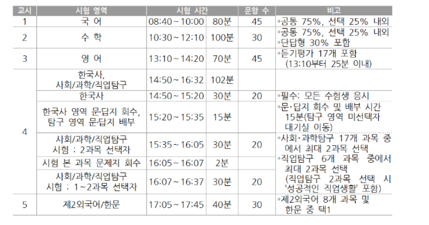 시험 시간대별로 보면 1교시 국어 영역(08:40~10:00), 2교시 수학 영역(10:30~12:10), 3교시 영어 영역(13:10~14:20), 4교시 한국사 영역 및 사회・과학・직업탐구 영역(14:50~16:37), 5교시 제2외국어/한문 영역(17:05~17:45)의 순서로 실시됩니다. 시험을 고사장에서 볼 수 없는 응시생들은 온라인으로도 응시가 가능합니다. 별도 홈페이지를 운영하여 6월 4일(금) 저녁 9시까지 운영할 예정이며, 홈페이지에 접속하여 답안을 입력 후 제출하면 별도의 성적을 제공합니다. 온라인 응시는 응시생 전체 성적에는 반영되지 않습니다.