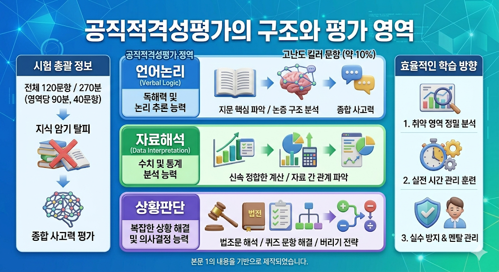 PSAT는 언어논리, 자료해석, 상황판단 세 가지 영역으로 구성되며 각 영역은 40문항을 90분 내에 해결해야 하는 고도의 집중력을 요구합니다. 언어논리는 지문의 핵심 파악과 논리적 추론 능력을, 자료해석은 수치와 통계 자료를 신속하고 정확하게 분석하는 능력을 측정하며, 상황판단은 법조문 해석 및 복잡한 퀴즈 해결 능력을 평가합니다. 이는 단순한 지능 지수 측정이 아니라 공직 업무 수행에 필요한 기초적인 인지 능력을 검증하는 과정이라 생각합니다. 단순히 많은 문제를 풀기보다는 각 영역이 요구하는 사고의 틀을 익히는 것이 우선되어야 하지 않을까 봅니다.