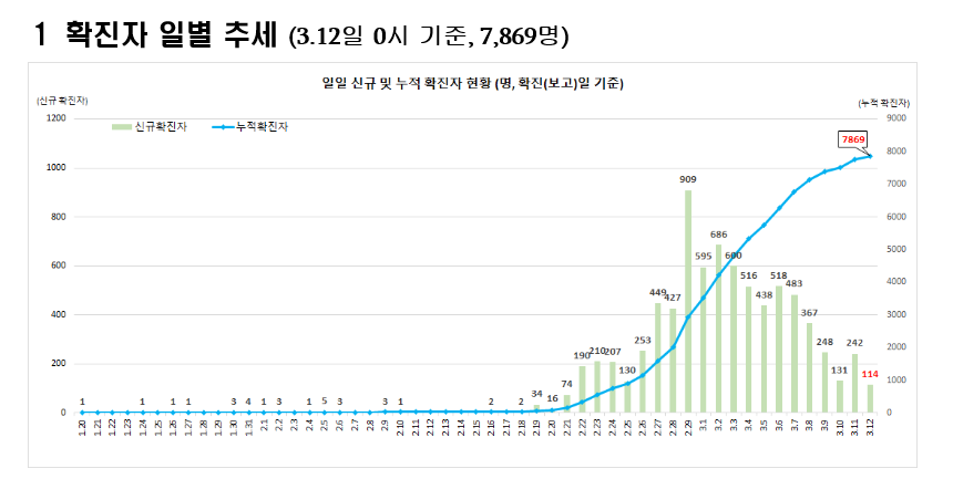 3월 12일 현재 대한민국의 확진자는 7,869명으로 114명이 증가하였는데 11일 증가분인 242명보다는 다소 감소하였습니다. 대구에서는 여전히 많은 확진자가 발생하고 있어 73명이 발생되었습니다. 또한 서울도 현재 212명의 확진자가 발생되면서 수도권에 비상이 걸린 상태입니다. 특히 구로구 신도림동에서 발생된 집단 감염 사례는 지금 같은 시점에서 대단히 긴장할 수 밖에 없는 상황입니다.