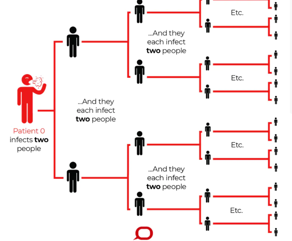 코로나 19가 유행하면서 알려진 전문용어 중에 재생산수라는 것이 있는데 정확히는 기초감염재생산수(Basic Reproduction Number)로 보통 RO로 줄여서 부르고 있습니다. 쉽게 풀어 말하면 한사람의 감염자가 다른 사람과 접촉하여 몇 명을 감염시키는 지를 수치화 한 것으로, 예를 들어 1사람이 2명을 감염시키면 RO값은 2가 됩니다. 현재 코로나 19의 평균 RO값은 2~3 정도인데 블특정 다수에 의한 전염, 좁은 공간에서 급격히 퍼지는 집단 감염의 영향으로 5이상으로 가는 경우도 있습니다. 한국을 코로나 재난으로 몰아 넣은 신천지 신도들의 경우 재생산 지수는 매우 높아서 7~10까지 올라갔던 것으로 추정되고 있습니다.