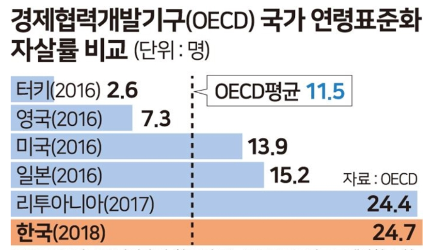 우리 나라의 자살률은 OECD 회원국으로 한정해 봐도 세계 최고 수준으로 높은 것은 잘 알려져 있는 사실입니다. 2018년 기준으로 세계 1위를 기록하고 있으니 정말 우울한 소식이 아닐 수 없습니다. 통계 자료에 따르면 인구 10만명당 자살자 수는 26.6명으로 OECD 평균 자살자 수 11.5명을 두 배 이상 훌쩍 뛰어 넘고 있습니다. 매일 37.5명 가량이 극단적인 선택을 하며 세상을 등지고 있다는 것인데 주위를 들러봐도 자살 소식이 너무 많은 것 같습니다. 이런 와중에 대중들에게 영향을 끼치는 연예인 들의 자살 또한 매우 높은 것으로 나타나 우려가 큰 상황입니다. 연예인들의 자살을 모방심리를 일으켜 자살률 증가에 일조를 하고 있다는 분석도 나오고 있습니다. 여기에 선정적인 언론의 자살 보도 또한 심각한 문제로 인식되고 있습니다.