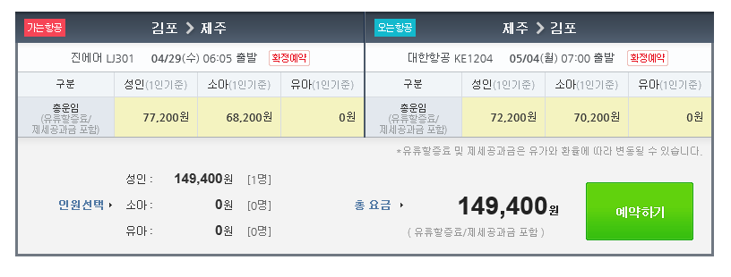 제주행 수요가 늘면서 운항편수도 연휴기간인 4월30일부터 5월 5일 사이에 411편으로 60% 가까이 증편되었습니다. 가격도 많이 올라서 수요가 없을 때는 2만원대까지 내려갔던 왕복 항공권 가격이 10만원대로 다시 올라간 상태입니다.