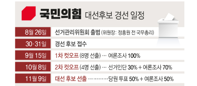 선거인단 투표도 진행되는데 국민의 힘은 당원으로 가입하고 당비도 1회 이상 납부하여 책임당원이 되어야 투표에 참여할 수 있습니다. 투표는 10월 6일부터 8일까지 2일간 실시되며 전국민 여론조사도 이때 함께 실시됩니다.