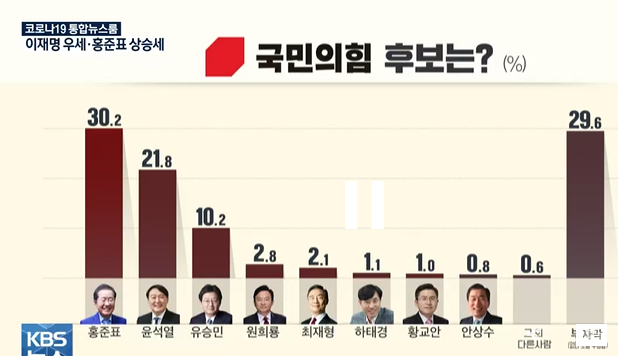 가장 최근 실시된 조사 결과를 보겠습니다. KBS가 한국리서치에 의뢰하여 9월 16일부터 18일까지 전국 만 18세이상 1천명을 대상으로 실시한 조사입니다. 자세한 내용은 KBS홈페이지와 중앙선거여론조사심의위원회 홈페이지에서 확인할 수 있습니다. 이 조사에서 야당 후보 지지율만 보면 국민의 힘 후보 적합도에서 홍준표 후보 30.2%, 윤석열 후보 21.8%, 유승민 후보 10.2%, 원희룡 2.8, 최재형 2.1 순입니다. 홍준표-윤석열 두 후보 간 격차는 8.4%포인트로, 오차 범위 밖으로 나타났습니다. 이 조사는 여당 지지자까지 포함된 결과입니다. 국민의 힘 지지층으로 한정해서 보면 윤석열 47.2%, 홍준표 34.8%로 결과가 다르게 나타납니다. 민주당 지지자들로 보면 홍준표 31.8%, 윤석열 4.9%로 나타나 여당 지지자들의 윤석열 후보에 대한 반감이 매우 크다는 것을 알 수 있습니다. 이른바 역선택 논란이 전혀 근거가 없는 얘기는 아닌 것을 알 수 있습니다.