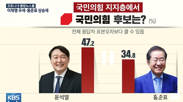현재 흐름을 보면 윤석열 후보가 1위를 계속 유지하고는 있지만 이제는 절대 강자가 아니라 홍준표 후보가 치고 올라 오면서 양강 구도로 재편되고 있습니다. 조사 결과에 따라서는 홍준표 후보가 국민의 힘 후보 적합도에서 윤석열 후보를 앞서는 경우도 있습니다.