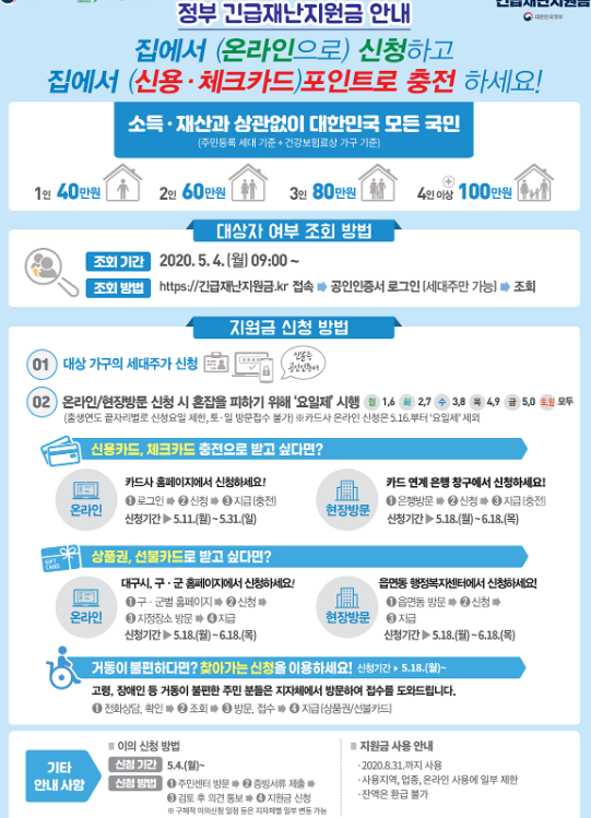 516일부터는 부제를 적용하지 않고 어느 때나 신청할 수 있습니다. 또한 518일부터는 카드와 연계된 은행 창구에서도 신청이 가능하며 기한은 역시 531일까지입니다.