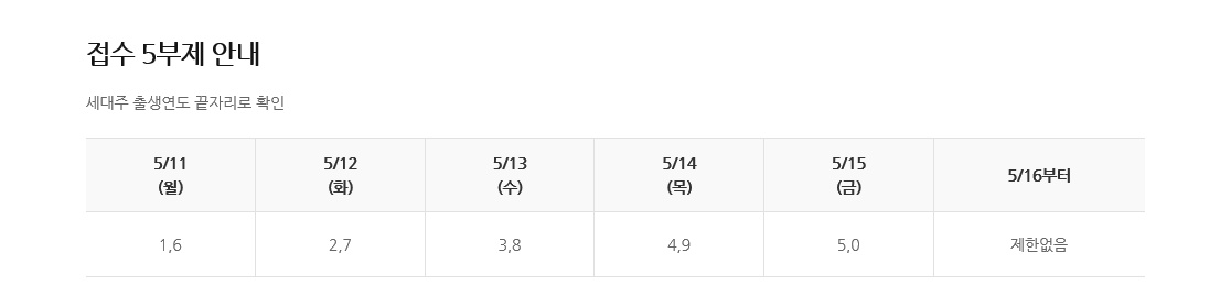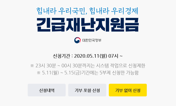 온라인 신청 기간 중 최초 5일간, 5월 11일부터 5월 15일까지는 사이트 폭주 및 다운 방지를 위하여 공적 마스크 구입과 동일한 형태인 부제로 운영합니다. 이미 마스크 구매를 이런 방식으로 해왔으니 큰 어려움은 없을 것입니다.