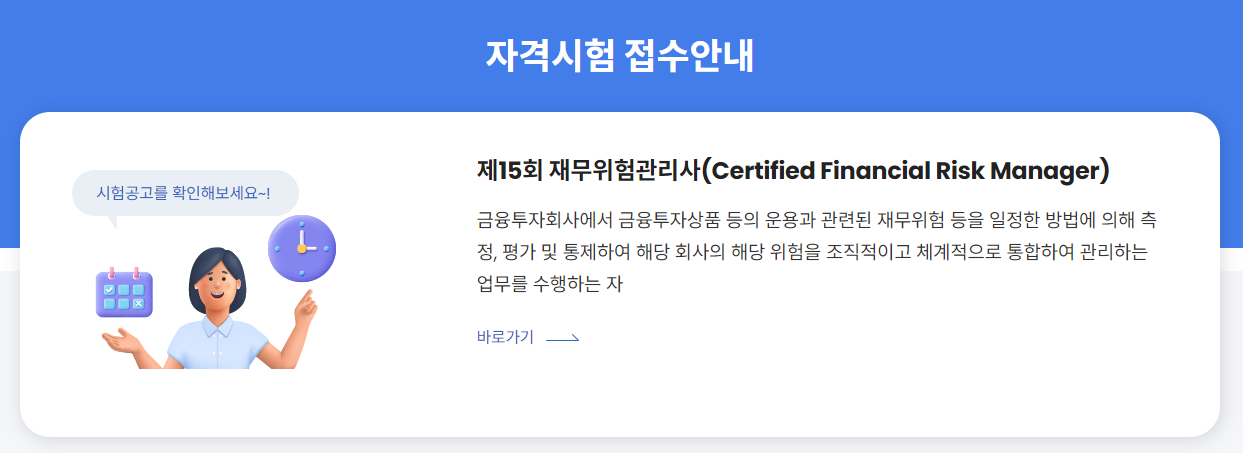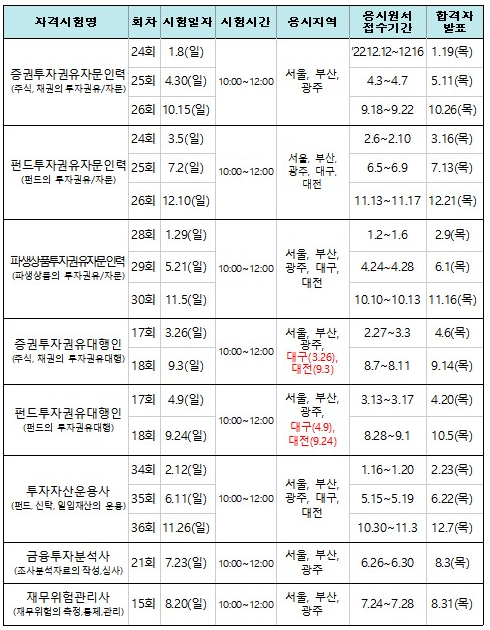 집합투자재산, 신탁재산 또는 투자일임재산을 운용하는 업무를 수행하는 자를 선발하는 투자자산운용사 시험은 23.10.30 ~ 23.11.03일까지 접수, 시험 11.26(일), 합격자발표 12.07(목)일입니다. 금융투자회사(법 제22조에 따른 겸영금융투자업자는 제외)에서 조사분석자료(금융투자상품의 가치에 대한 주장이나 예측을 담고 있는 자료)를 작성하거나 이를 심사, 승인하는 업무를 수행하는 금융투자분석사는 접수는 마감되었으며 7월 23일 시험, 8월 3일 합격자 발표입니다. 금융투자회사에서 금융투자상품 등의 운용과 관련된 재무위험 등을 일정한 방법에 의해 측정, 평가 및 통제하여 해당 회사의 해당 위험을 조직적이고 체계적으로 통합하여 관리하는 업무를 수행하는 재무위험관리사 시험 접수는 23.07.24 ~ 23.07.28일, 시험은 8.20일, 합격자발표는 8월 31일입니다. 합격기준은 거의 응시과목별 정답비율이 40% 이상인 자 중에서, 응시 과목의 전체 정답 비율이 70%(70문항) 이상인 자로 한정하고 있으므로 과락은 40점임에 유의해야 합니다.
