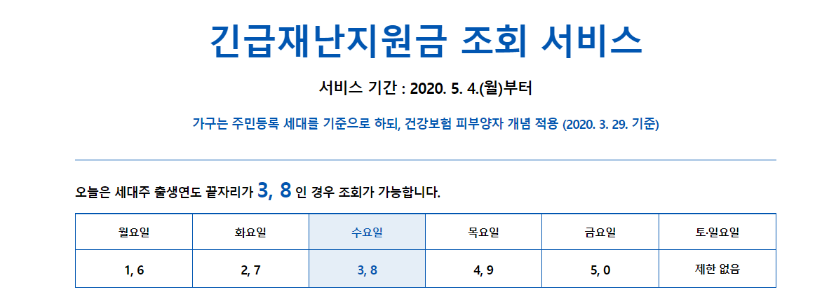 긴급재난지원금 조회 사이트(https://www.긴급재난지원금.kr/)에서 내가 받을 수 있는 금액은 얼마나 되는지 조회해 볼 수 있습니다. 마스크 구매 시 적용되고 있는 5부제 방식을 동일하게 적용하여 출생 연도별 조회 가능 요일이 정해져 있습니다. 출생 년도 1/6이면 월요일, 2/7은 화요일, 3/8은 수요일, 4/9는 목요일, 5/0은 금요일에 각각 조회, 신청이 가능합니다.