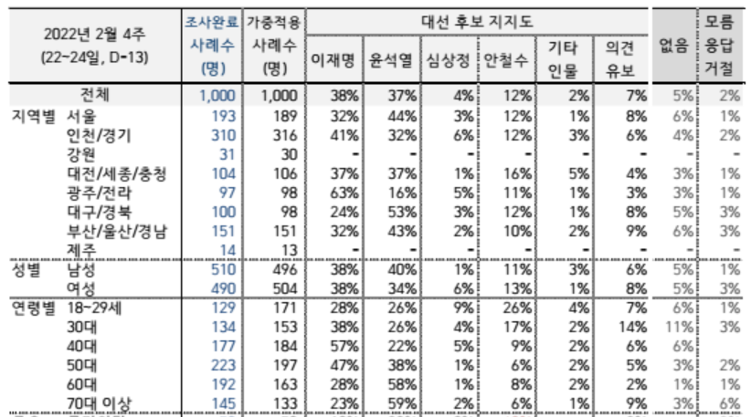 여론조사 기관인 (주)한국갤럽조사연구소는 주 단위로 정기조사를 통하여 대통령 선거, 정당지지도를 조사, 발표하고 있습니다. 최신 조사 결과로 2022년 2월 4주 차 결과가 발표되었습니다.