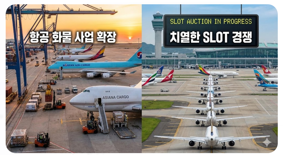 일반 승객들의 눈에는 잘 보이지 않지만, 항공 산업의 알짜배기인 화물 사업과 공항 슬롯(이착륙 권리)에서도 거대한 이동이 일어나고 있습니다. 독과점 해소를 위한 조치로 아시아나항공의 화물기 사업부가 매각되어 에어인천이 이를 인수하게 되었습니다. 이는 국내 항공 화물 시장이 '대한항공 vs 아시아나'의 구도에서 '대한항공 vs 화물 전문 항공사'의 구도로 재편됨을 의미합니다. 여객과 화물을 병행하던 아시아나의 화물 물량이 전문 화물사로 넘어가면서, 물류 처리 방식과 영업망에도 상당한 변화가 예상됩니다.