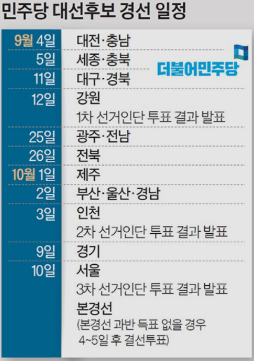 경선 연기에 따른 후보들간 유불리가 있기도 하지만 현재 상황을 감안하면 불가피한 선택이었던 것으로 보입니다. 앞선 주자들은 연기를 최소화 하기를 원했고 쫓아가는 후보들은 최대한 늦추기를 바랬는데 어느 정도 절충점을 찾아 시기를 정한 것 같습니다. 새로운 일정에 따라 권역별을 순회하며 치를 예정이었던 순회 경선 일정도 함께 지연되었습니다. 순회 경선 일정은 8월 7일 시작할 예정이었습니다. 연기에 따라 권역별 순회 경선은 9월 4일 대전, 충남 지역부터 시작합니다. 관심 지역인 대구, 경북 9월 11일, 광주, 전남 9월 25일, 부산, 울산, 경남 10월 2일, 경기 10월 9일이며 서울에서는 10월 10일에 열립니다. 과반 득표자가 없을 경우 4~5일후인 10월 15일경에 결선투표가 진행됩니다.