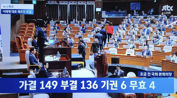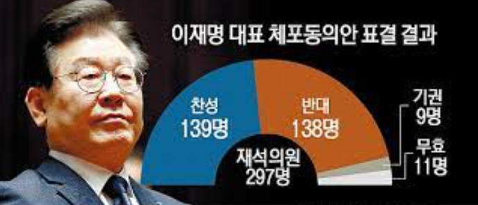 21일 국히 본회의날 이재명 대표에 대한 체포동의안 표결이 있었는데 여기에서 참석 의원은 295명으로 가결에 필요한 인원은 출석인원의 과반수 찬성으로 가결 정족수는 148표였습니다. 표결 결과 찬성은 149표, 반대 136표, 기권 6표, 무효표는 4표였습니다. 1표 차이로 과반수를 넘기면서 가결이 된 것인데 민주당 재석 의원이 168석, 민주당 출신 무소속 7명을 감안하면 175표로 전부 부결에 표를 던졌다면 가결되지는 않았을 것입니다. 국민의 힘은 11석, 정의등 등 친여세력을 포함해도 121석으로 민주당의 가결 반란표에 달려 있던 것인데 최소 28명이 가결에 표를 던짐으로서 제1야당 대표가 구속 기로에 놓이는 초유의 상황이 벌어진 것입니다.