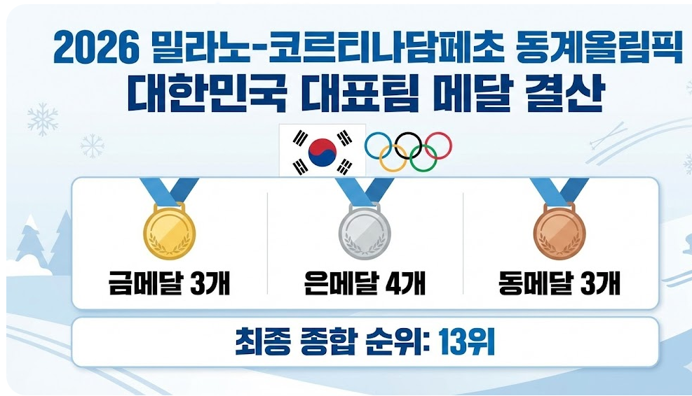 Intro 2026년 이탈리아 밀라노 코르티나담페초에서 개최된 동계올림픽이 전 세계 스포츠 팬들의 이목을 집중시킨 가운데 대장정을 마무리했습니다. 이번 대회에서 대한민국 국가대표팀은 총 금메달 3개 은메달 4개 동메달 3개를 획득하며 빙상과 설상 종목 모두에서 괄목할 만한 성과를 기록했습니다. 험난한 여정 속에서도 우리 선수단이 보여준 투혼은 국민들에게 깊은 감동을 선사했습니다. 종목별 메달 집계 현황을 살펴보면 전통의 효자 종목인 쇼트트랙에서 김길리 선수의 2관왕 등극과 최민정 선수의 대한민국 올림픽 최다 메달 경신이라는 대기록이 쓰여졌습니다. 더불어 설상 종목인 스노보드에서 최가온 선수가 사상 첫 금메달을 목에 걸며 한국 동계 스포츠의 지평을 완벽하게 넓혔습니다. 이번 2026 밀라노 코르티나담페초 동계올림픽 대한민국 메달 집계 현황과 주요 선수들의 활약상을 상세히 짚어보고 국가별 종합 순위 13위 달성의 의미를 분석하여 앞으로 한국 동계 스포츠가 나아가야 할 방향성을 전망해보고자 합니다.