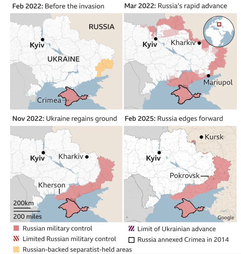 이번 전쟁에서 우크라이나의 유일한 성과 라면 지난해 8월 러시아 국경 너머로 우크라이나 군대가 기습 공격을 감행하여 해당 지역의 일부를 점령하고, 러시아 지역으로 최대 18마일(30km)까지 진격한 것입니다. 이때 러시아 정부는 국경 지역에서 약 20만 명의 사람들을 대피시켰고, 푸틴은 우크라이나의 공세를 "중대한 도발"로 비난하기도 했습니다. 우크라이나는 1,200km2가 넘는 러시아 영토와 93개 마을을 장악했다고 주장하고 있으며 이후 러시아는 일부 영토를 회복했지만 우크라이나는 여전히 쿠르스크 지역에 군대를 주둔시키고 있습니다. 이 지역을 탈환하기 위하여 러시아는 북한군을 끌어들이기도 하였으며 여전히 교전이 벌어지고 있습니다. 하루라도 빨리 전쟁을 마무리 하려는 러시아 입장에서는 협상 전 이 지역을 반드시 탈환하고자 할 것입니다. 젤렌스키는 쿠르스크 지역을 저울 삼아 그들이 잃어 버린 영토와 교환 가능성도 내비쳤으나 현실성은 없습니다. 전투는 주로 우크라이나 동부에서 벌어지고 있으며, 수개월에 걸쳐 러시아군이 천천히 진군하면서 적어도 7만 명의 러시아군이 사망했고 , 양국 합쳐 총 50만 명이 사망하거나 부상당한 것으로 추정됩니다.