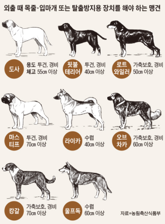 법에서 시행하는 규정은 맹견을 데리고 나갈 때는 반드시 입마개와 목줄을 착용해야 하며 소유자 즉 견주가 반드시 동반을 하게끔 되어 있습니다. 공동주택내 사육 금지이니 아파트에서는 키울 수 없습니다. 어린이집, 유치원, 초등학교 등에는 출입을 할 수 없게 되어 있습니다. 이러한 의무 사항을 준수하지 않을 경우에는 300만원 이하의 과태료를 처분할 수 있게 되어 있습니다. 이런 개들(다른 반려견 포함)에 의하여 타인이 사망할 경우에는 3년 이하의 징역이나 3천만원 이하의 벌금형에 처해지게 됩니다.