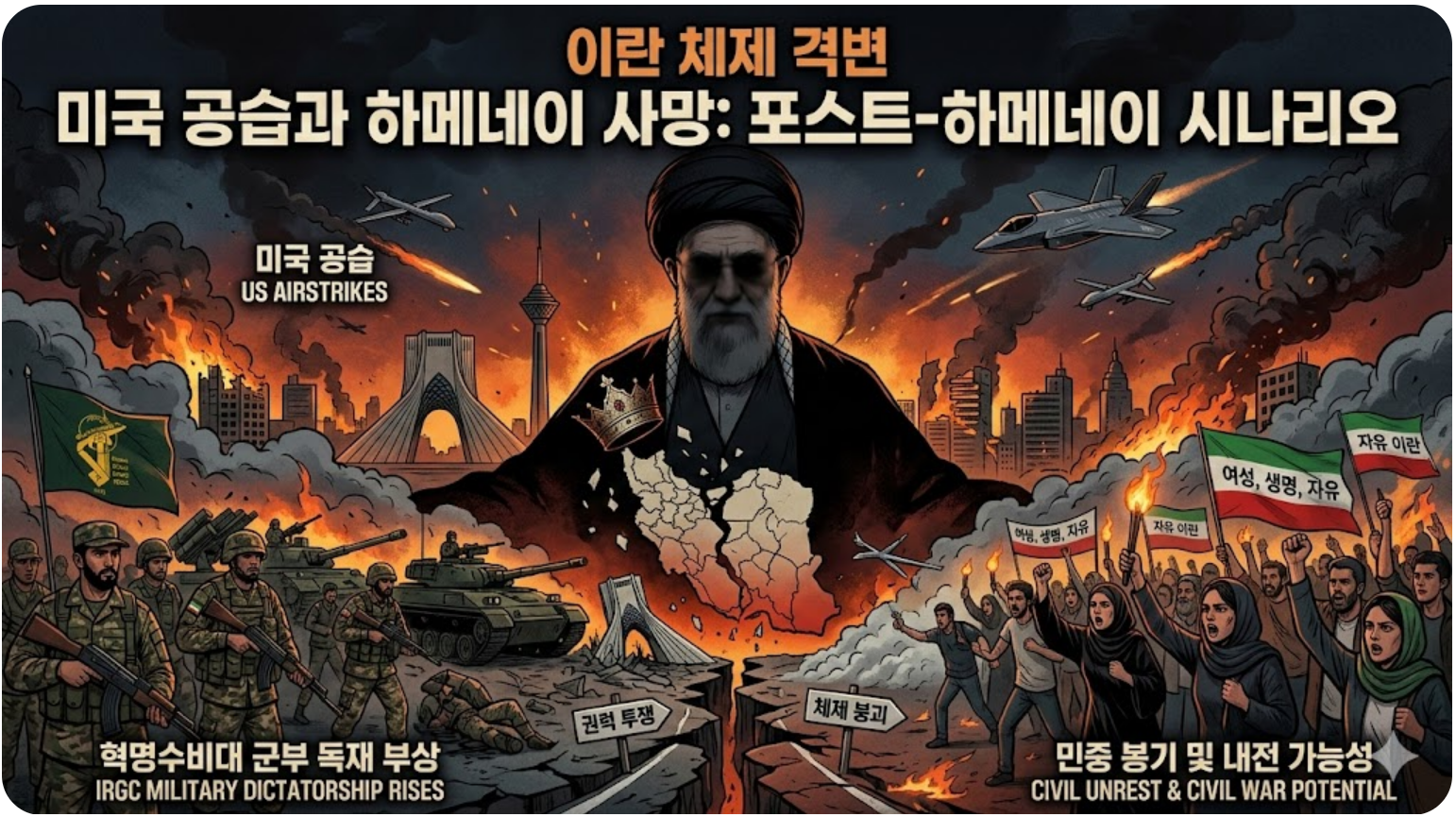 - 혁명수비대의 권력 장악: 종교적 권위의 공백을 메우기 위해 무력을 가진 혁명수비대(IRGC)가 전면에 나서는 군사 독재화 가능성이 높습니다.