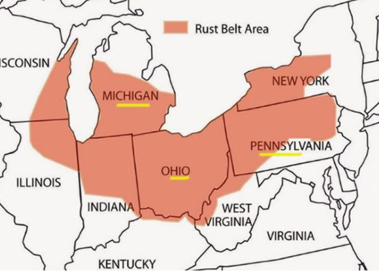 러스트벨트(Rust Belt)는 직역하면 녹슨 지대라는 뜻으로 미국 북부의 큰 호수인 오대호 인근에 위치하고 있는 공업 도시 지역을 의미합니다. 오대호 주변으로는 철광석이 풍부했고 호수를 끼고 있어 공업이 발전하기에 좋은 지리적 위치여서 과거에는 선도적인 공업 국가였던 미국을 대표하는 지역이었습니다. 그렇게 번성하던 제조업은 인건비가 싼 중국, 동남아 지역으로 이전하게 되고 산업 구조에서 밀려나며 자연스럽게 여기에 위치하고 있는 도시들은 쇠락하게 된 것입니다.