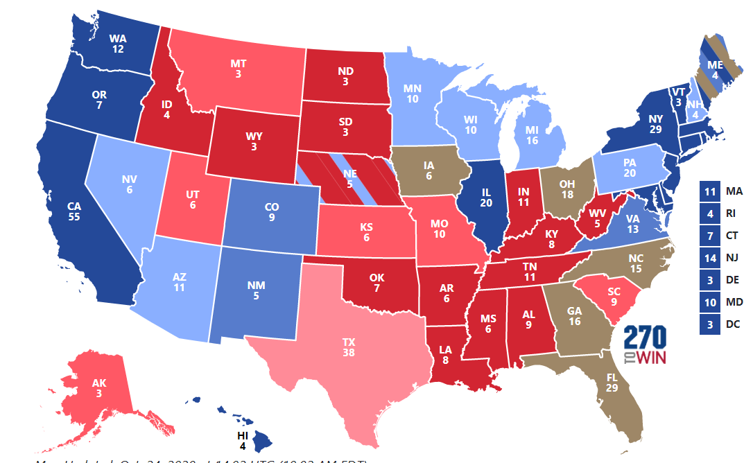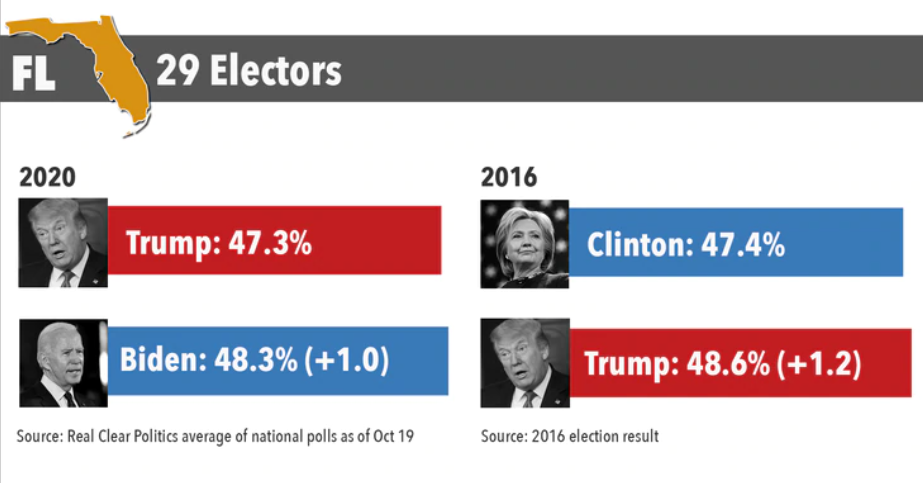 플로리다주는 29명으로 이번 선거에서 대단히 중요한 지역인데 노년층이 많이 거주하는 이 지역에서 민주당이 불리할 것으로 알려졌는데 당초 바이든이 지지율에서 앞서고 있었으나 현재 트럼프가 거의 따라잡은 것으로 나타나고 있어 큰 변수로 작용할 것 같습니다. 쿠바계 히스패닉과 연금 생활자인 노년층들은 대체로 공화당을 지지하고 있는데 코로나로 많은 노년층이 희생된 것은 트럼프에게 불리할 수도 있습니다. 역대 선거에서 승자가 계속 뒤바뀌고 있는 지역으로 이번 선거에서 이 곳을 잡는 후보가 승자가 될 것으로 보고 있습니다.