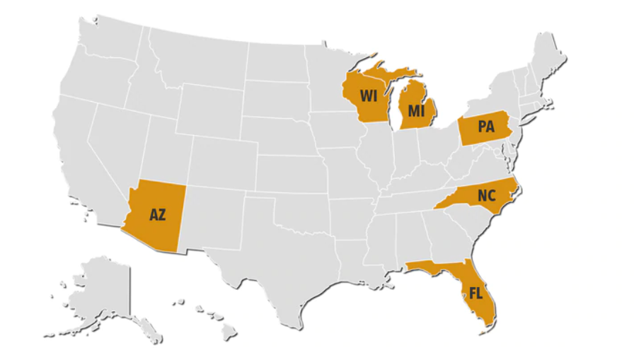 미국 대선에서 우열을 가리기 어려운 지역으로 분류하는 경합주는 위에서 살펴본 러스트벨트 지역에 속한 지역들이 많이 있는데 그 중에서도 펜실베이니아, 미시간, 위스콘신을 경합주로 분류하고 있습니다. 이 3곳과 선벨트로 분류되는 지역인 미남부 지역의 플로리다가 대표적인 경합주입니다. 여기에 더하여 노스캐롤라이나, 애리조나주도 우열을 가리기 힘든 경합주입니다.