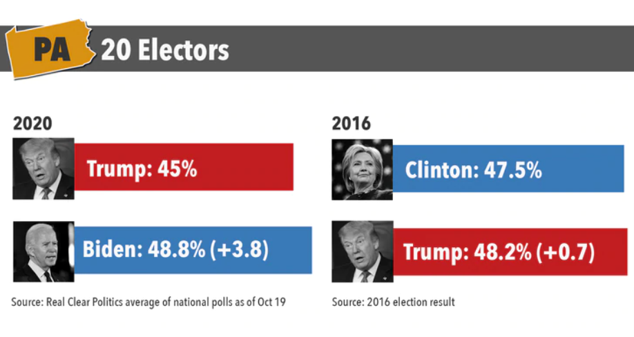 제조업이 번성할 당시 노동조합의 영향력도 매우 컸으며 근로자들은 거의 민주당을 지지했던 전통적인 민주당 우세 지역으로 분류되었단 지역인데 지난 2016년 대선에서 트럼프가 일리노이, 뉴욕을 제외한 지역에서 다 승리하면서 당선에 결정적인 지역이 되었습니다. 총 538명의 선거인단 중 과반수 270명을 확보하면 당선이 되는데 이 곳 러스트벨트 8곳의 선거인단 수는 120명으로 비중이 적지 않습니다. 제조업 부흥을 내세우며 저소득층 백인 노동자를 파고드는 공화당 트럼프의 우세가 이번에도 이어지게될 지 주목되는데 현재까지는 민주당 바이든 후보가 근소하게 앞서 있는 것으로 나타나고 있습니다.