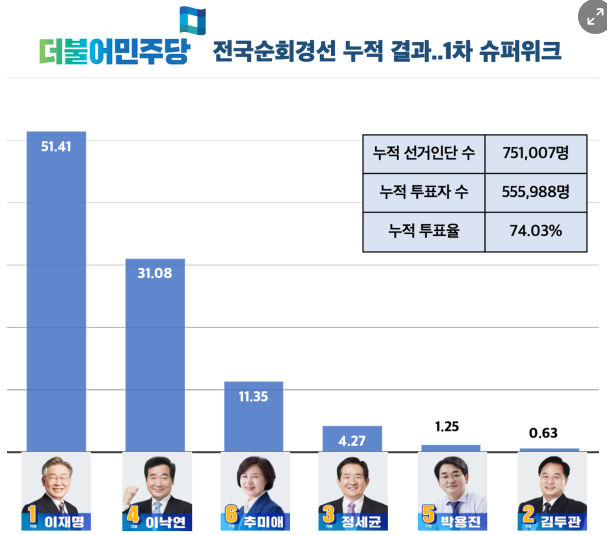 4지역의 결과를 보면 이재명 지사는 대전, 충남 54.81%, 세종, 충북 54.54%, 대구, 경북 51.12%, 강원 55.36%를 얻으며 누적 투표율 51.41%를 기록하고 있습니다. 2위 후보인 이낙연 전대표는 세종, 충북에서의 29.72%가 가장 높은 결과로 한참 밀리고 있습니다. 누적 득표율은 31.08%입니다. 다음 3위로는 추미애 후보로 누적 11.35%, 4위는 정세균 후보 4.27%, 5위 박용진 후보 1.25%, 6위는 김두관 후보로 0.63%입니다. 사실상 양강 구도이기는 한데 1,2위의 격차가 크게 벌어져 있어 이대로라면 이재명 지사의 압승이 예상됩니다. 전체 선거인단은 75만 1,007명이며 이중 55만5,988명이 투표에 참여하여 투표율은 74.03%입니다.
