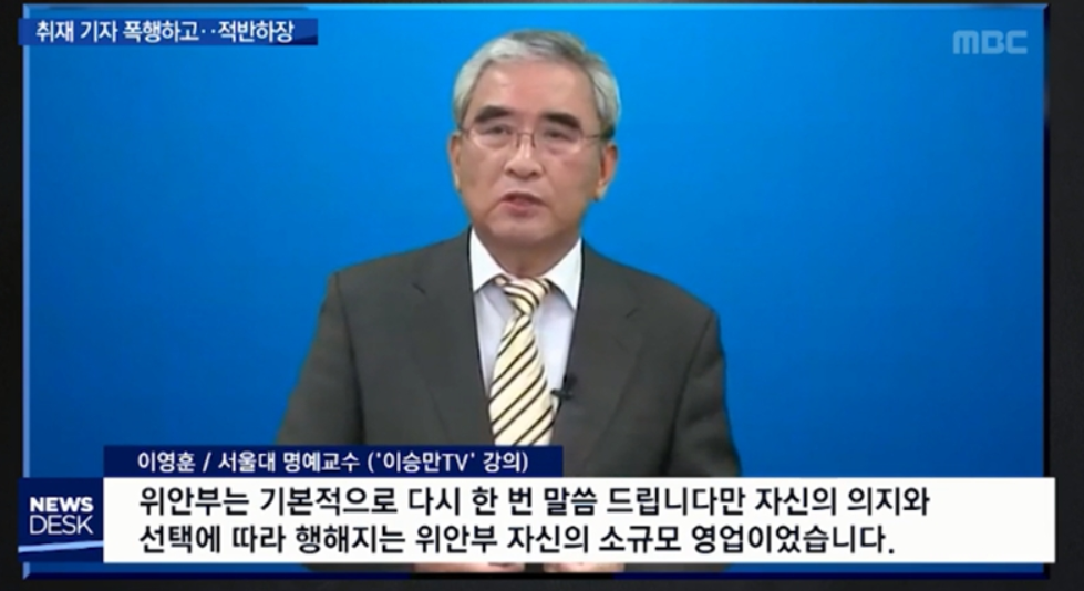 그런 그가 이번에 책자에서 나왔던 황당한 내용에 대하여 취재를 나갔던MBC기자에게 욕설을 퍼붓고 폭행까지 하며 뉴스에 등장하고 있습니다. 당장 MBC에서는 강력히 항의하고 있으나 이영훈 교수 측은 기습적인 인터뷰에 정당 방위를 한 것이라며 오히려 기자를 비난하고 촬영된 영상도 방영하지 말라는 가처분 신청을 법원에 내기도 했는데 이는 법원에서 기각이 되었습니다.