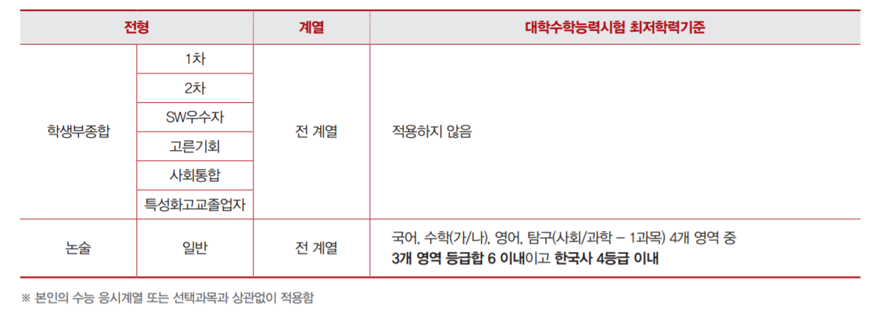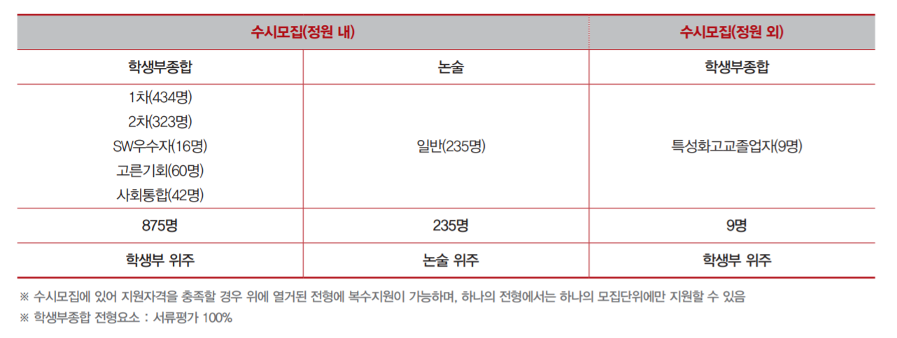 학생부종합 1차와 2차는 자기 소개서 제출 시기와 모집 단위에서 차이가 있습니다. 1차 전형은 수능 이전 9월 원서를 접수할 때 자기소개서를 제출하며 2차 전형은 수능 이후에 제출합니다. 모집단위도 1차는 학과별로만 모집하며 2차는 학과별, 학부, 계열 모집으로 확대됩니다. 모집인원은 1차는 434명, 2차로는 323명을 선발합니다. 서류 평가 100%이며 수능최저 기준은 없으며 면접 전형은 실시하지 않습니다. 기타 학생부 종합 전형으로 SW우수자 16명, 고른기회 60명, 사회통합 42명을 뽑습니다.