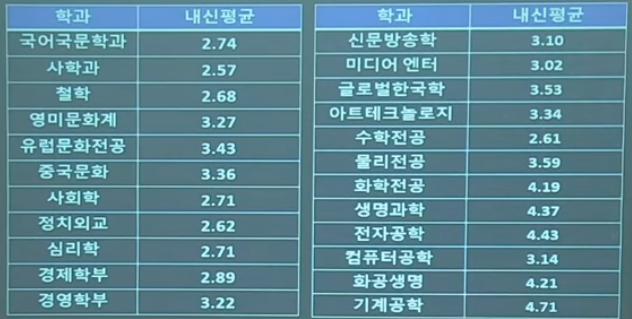 자연계에서는 수학전공 2.61, 미디어엔터테인먼트 3.02, 신문방송학 3.10이며 기계공학전공이 4.71로 가장 낮았습니다. 인문계열 평균 등급은 3.04, 자연계열은 3.69로 인문계열이 다소 높은 편입니다. 상위권 대학은 다른 대학도 비슷하겠지만 일반고와 특목고의 합격생들이 섞여 있습니다.