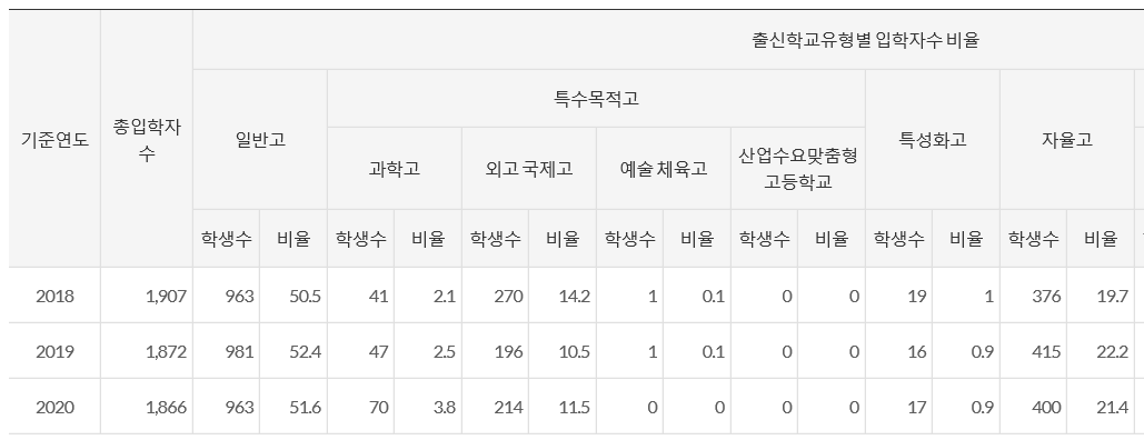 대학알리미 공시자료를 보면 2020학년도 기준으로 일반고 출신은 51.6%, 과학고, 국제고, 외고등 특목고 학생 입학 비율은 15.3%였습니다. 인문계의 경우 일반고 학생들은 1등급 중반대, 자연계는 2등급 초반까지면 합격을 노려볼 수 있을 것 같습니다.