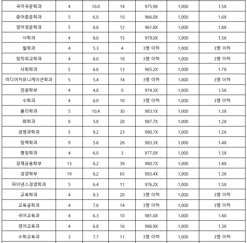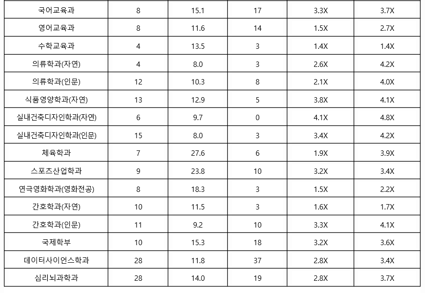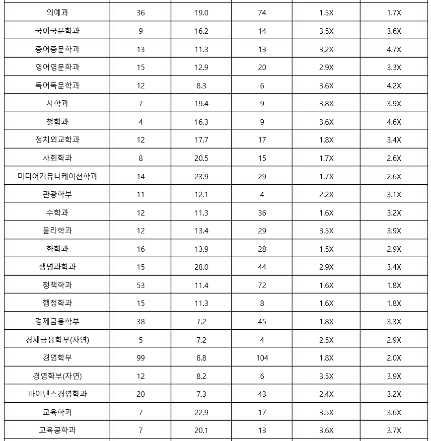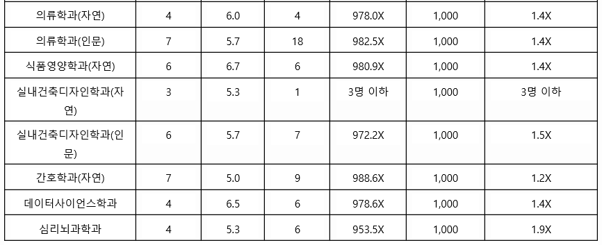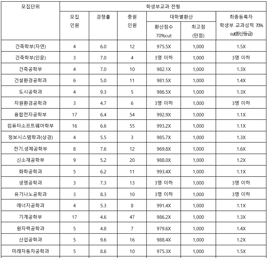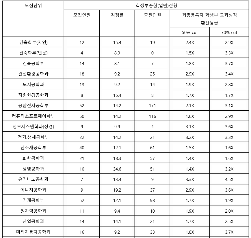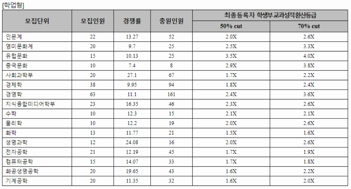 2021학년도에는 학생부 종합 1차, 2차로 구분하여 신입생을 선발하였으며 올해는 변화가 있으니 교과 성적 수시 등급은 참고자료로만 보면 되겠습니다. 최종 등록자 70%컷 기준으로 학생부 종합 1차에서는 신문방송학과가 1.5등급대로 가장 높은 등급대였습니다. 국어국문학 3.1, 사회학 3.4, 심리학 1.9, 물리학 4.5, 생명과학 2.2, 화공생명공학 2.6, 기계공학 2.8등급입니다.