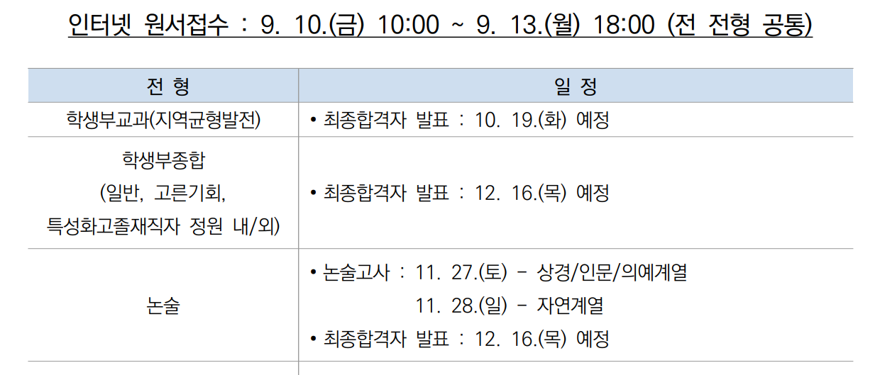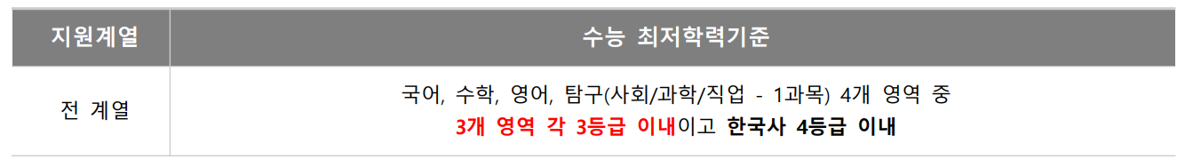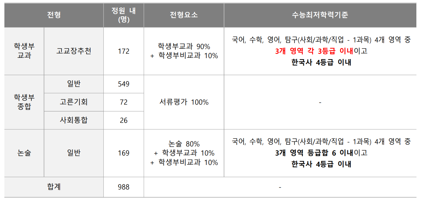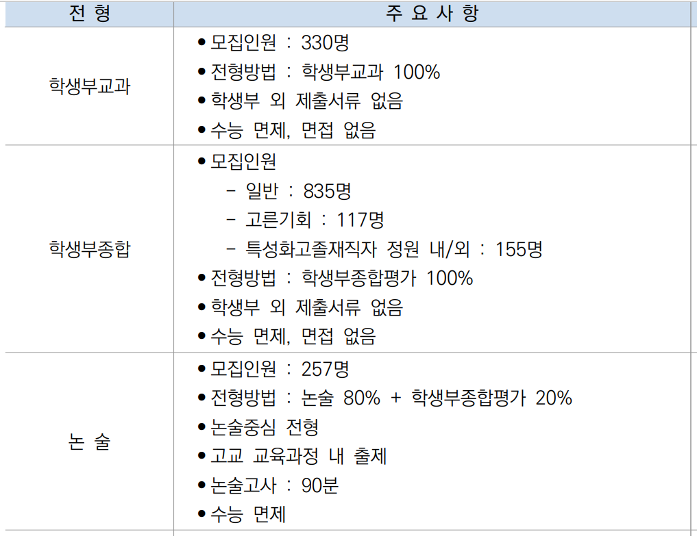 주요 변경 사항은 학생부 교과 전형이 신설되었으며 학생부 종합 전형은 선발 비율이 37.1%로 축소된 내용입니다. 정시 모집 선발 비율 확대에 따른 인원 조정입니다. 성균관대학교도 학생부 교과 전형은 고교장 추천 전형으로 모집하며 수능최저학력기준을 적용합니다. 인문계는 국어, 수학, 사탐/과탐(2개 과목 평균) 중 2개 등급합 5이내 및 영어 3등급 ․ 한국사 4등급 이내이며 자연계는 국어, 수학, 과탐(2개 과목 평균) 중 2개 등급합 5이내 및 영어 3등급 ․ 한국사 4등급 이내입니다. 자기 소개서는 학생부교과, 일부 실기, 실적 전형을 제외하면 제출 필수입니다. 합격자 발표는 12월 16일 이전입니다.