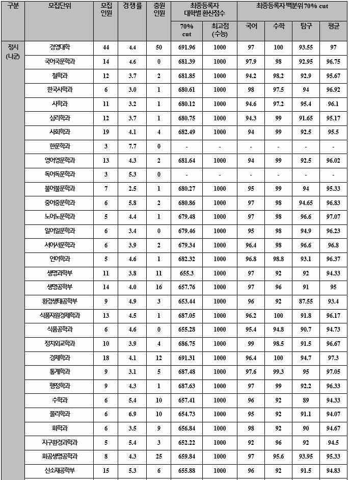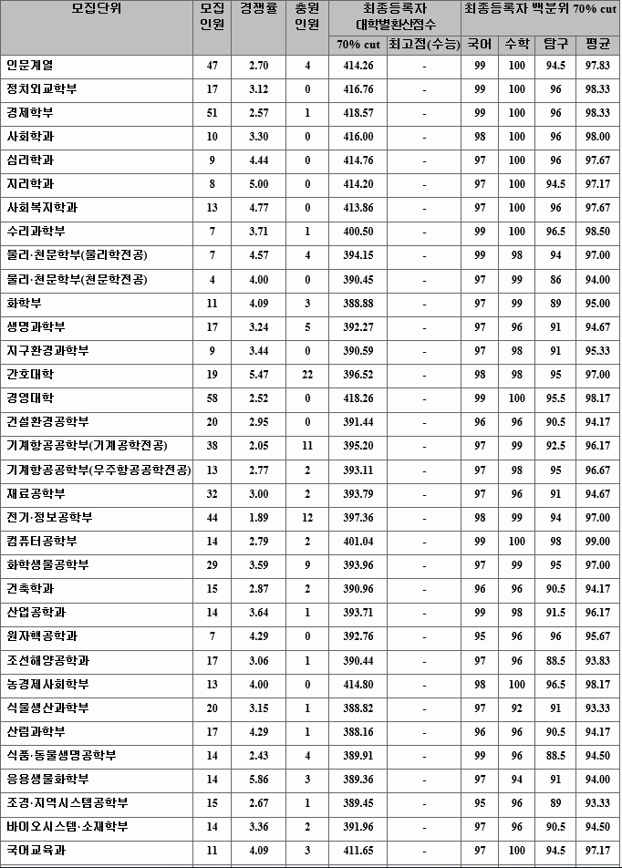 2020년 70%컷 기준으로 보면 경영대학 97, 심리 95.17, 국어국문 96.75, 정치외교 96.67, 교육 96.37, 의과대학 98.83, 수학 94.33, 기계공학 95.17, 전기전자공학 95.85, 자연계 컴퓨터학과 96.67 등이었습니다. 인문계 평균 백분위는 96.7, 자연계는 95.4, 정시등급 1.4이내입니다.