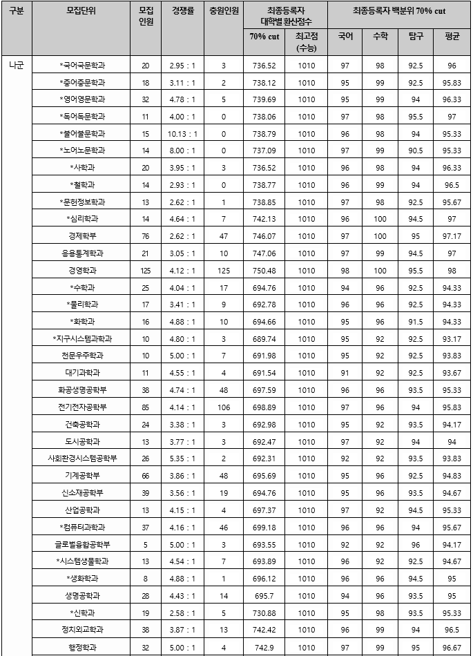 2020년도 등록자 70%컷 기준 국어, 수학, 탐구 평균 백분위를 살펴 보면 인문계열 97.83, 경영대학 98.17, 정치외교 98.33, 사회복지 97.67, 국어교육 97.17, 농경제 사회 98.17, 의예 99.50, 수리과학 98.50, 전기정보공학 97..00, 컴퓨터공학 99.00, 바이오시스템, 소재 94.50입니다. 인문계 평균 백분위 98.3, 자연계는 96.7입니다. 정시등급은 1.3이내입니다.