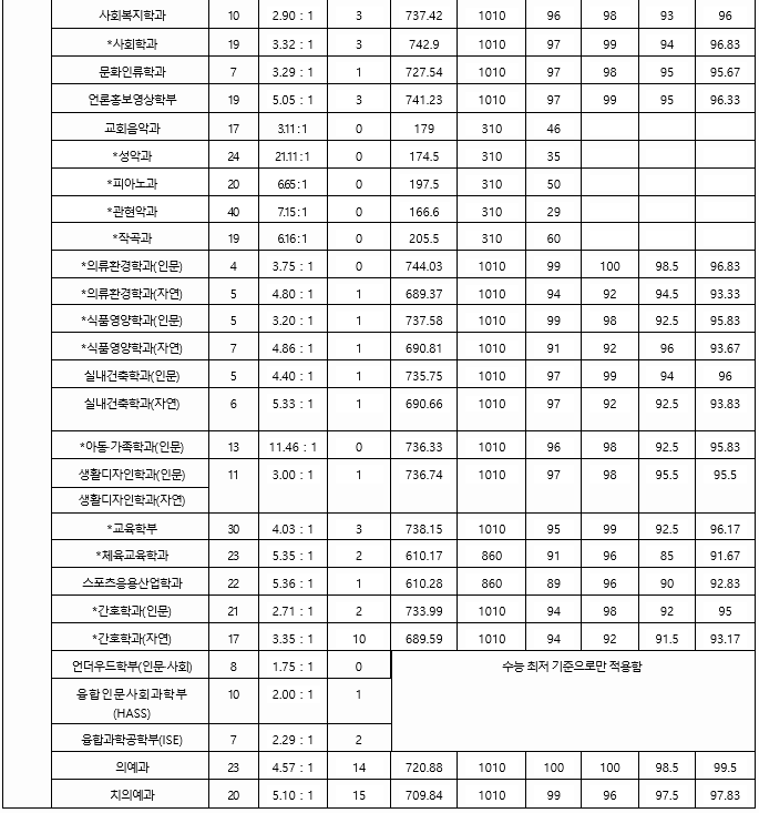 2020년 합격자 70%컷 기준 과목 평균 백분위를 보면 국어국문 96, 경영 98, 경제 97.17, 사학 96.33, 문헌정보 95.67, 의예 99.5, 치의예 97.83, 수학 94.33, 신소재공학 94.67, 컴퓨터과학 95.67이었습니다. 인문계열 평균 백분위는 96.7, 자연계는 95.7입니다. 정시등급으로는 1.4이내입니다.