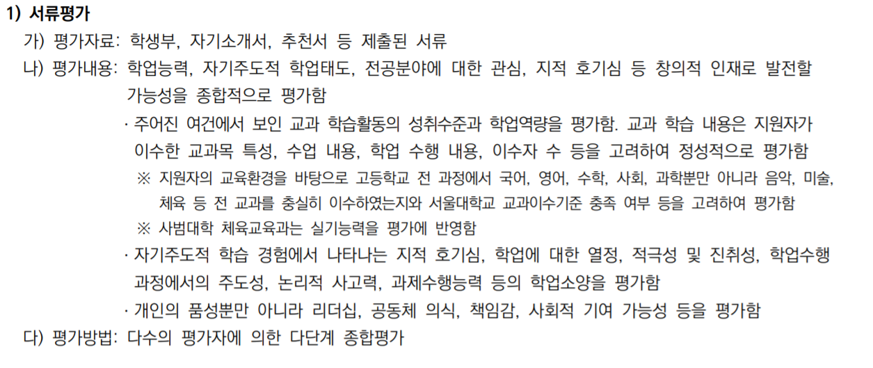 서울대 수시모집은 학생부 교과 없이 학생부 종합전형으로만 신입생을 선발합니다. 즉 내신, 교과 성적만 우수하다고 되는 것이 아니며 학교에서의 비교과 분야에서의 활동도 두각을 보여야 한다는 것입니다.