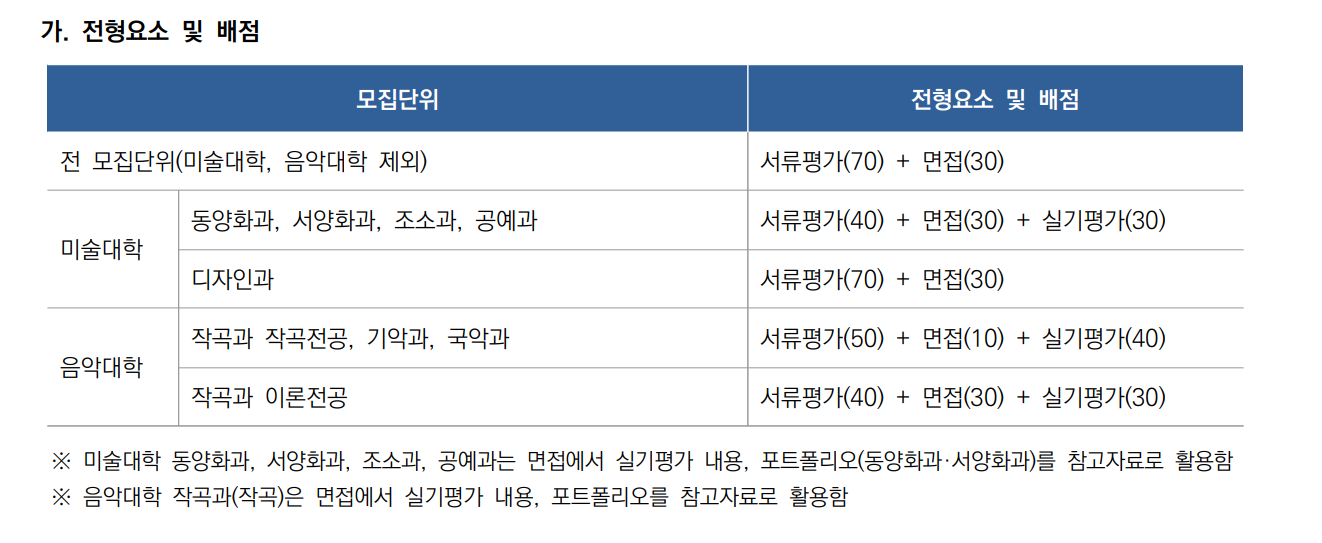 학생부종합전형(지역균형선발전형)은 서류평가 70%, 면접 30%비율입니다. 음악대학을 제외한 전 모집단위에서 수능최저학력기준이 있으며 4개 영역(국어, 수학, 영어, 탐구) 중 3개 영역 이상 2등급 이내입니다. 소속 고등학교장 추천을 받은 2022년 2월 국내 고등학교 졸업예정자 대상이며 고등학교별 추천 인원은 2명 이내입니다. 제출서류는 학교생활기록부, 자기소개서, 추천공문입니다. 학생부종합전형(일반전형)은 미술대학, 사범대학, 음악대학을 제외하며 1단계 서류평가 100% 2배수 선발, 2단계에서 1단계 성적 100점, 면접 및 구술고사 100점 만점입니다. 일반전형 사범대학 체육교육과만 수능 최저학력기준이 있으며 4개 영역(국어, 수학, 영어, 탐구) 중 2개 영역 이상 4등급 이내입니다.