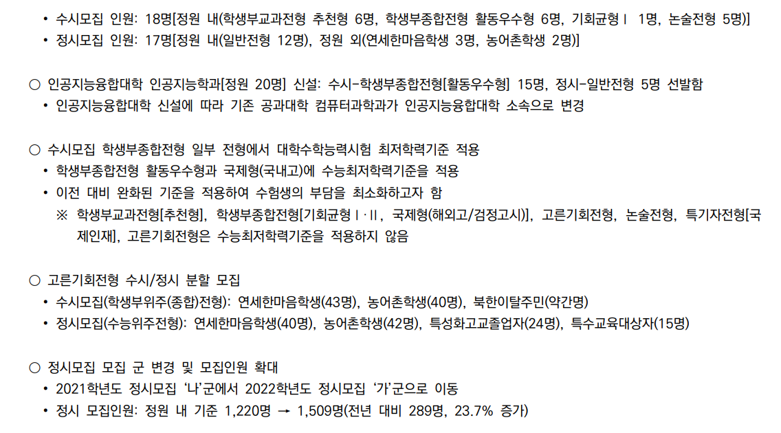 2022년도 주요 대학의 수시모집 비율은 이전과 비교하면 감소한 것이 큰 특징입니다. 수능 시험 위주인 정시 모집 비율을 40% 이상 상향 조정해야 한다는 교육부의 지침이 나오면서 대학들도 이에 맞춰 2022학년도 수시모집 인원을 조정한 것이 눈에 띄고 있습니다.