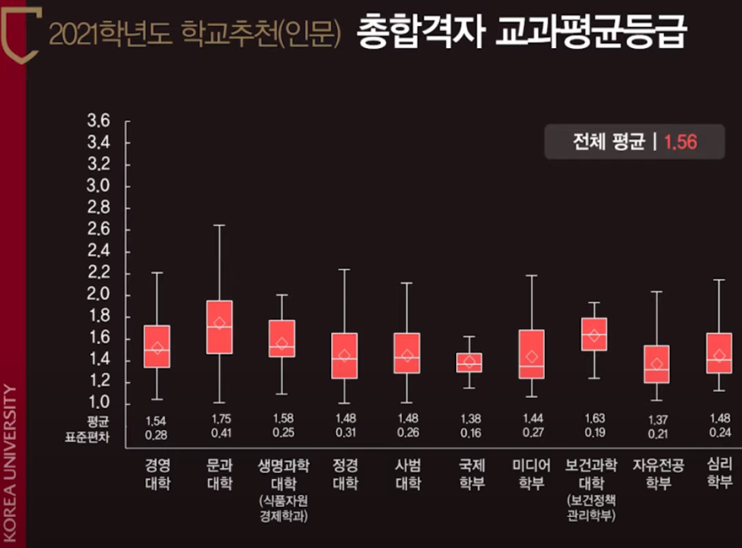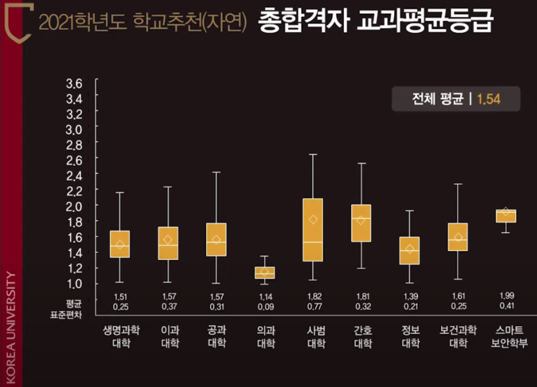 고려대학교 2021학년도 수시모집 입시결과를 살펴 보면 학교장추천 전형은 평균 교과등급은 1등급 이내입니다. 인문계 정치외교학과 1.33, 자연계 의과대학 1.17로 가장 높습니다. 주요 학과를 보면 인문계 사회학과 1.38, 미디어학부 1.46, 경영대학 1.58, 자연계 컴퓨터학과 1.40, 생명공학 1.48, 기계공학 1.56 등입니다. 전체 평균은 인문계 1.56등급, 자연계 1.54입니다. 학생부 종합 학업우수형은 교육학과가 2.16으로 가장 높으며 의과대학은 1.53입니다. 70%컷 기준으로 2등급대 성적입니다.