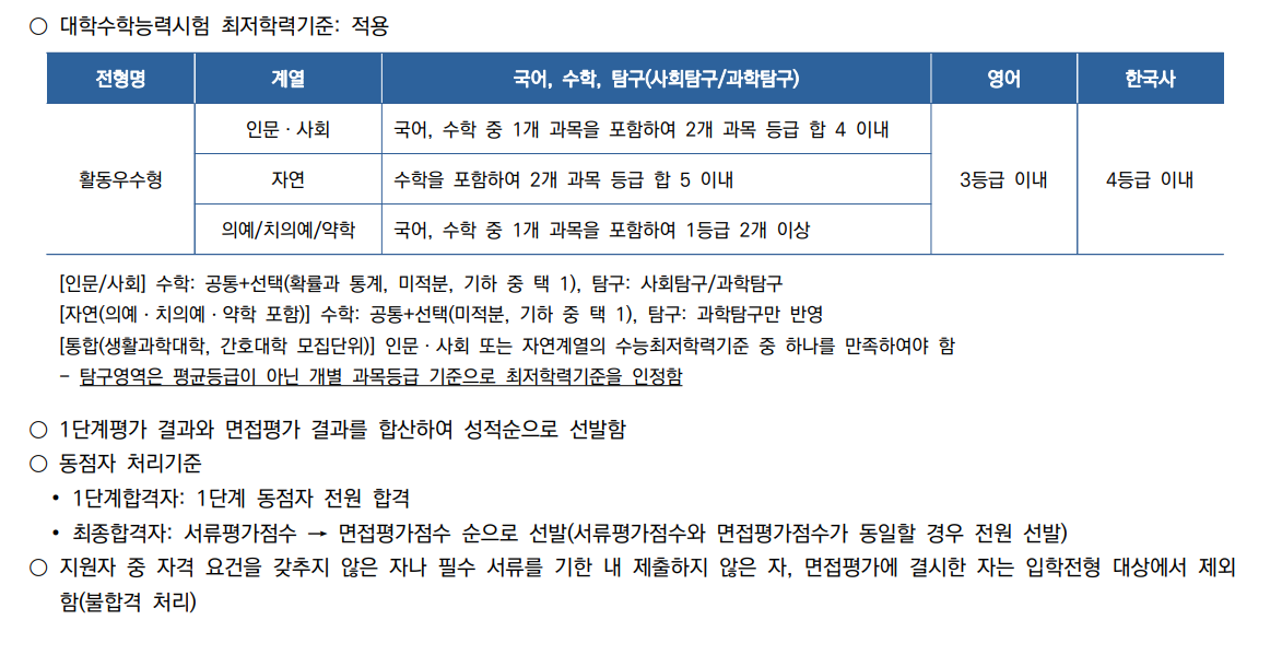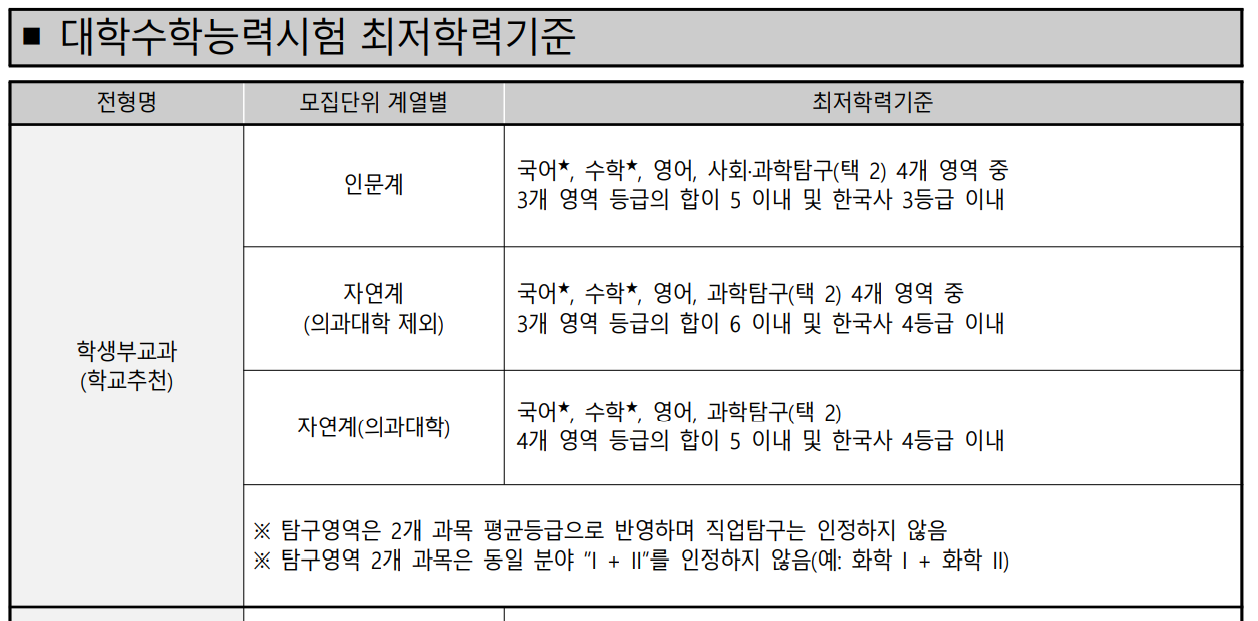 학생부교과 학교추천전형은 3학년 재적 학생 수의 4%까지 추천할 수 있으며 계열별(인문‧자연)로 지원 인원을 제한하지 않습니다. 수능 최저학력기준을 적용하며 인문계 모집단위 국어, 수학, 영어, 사회·과학탐구(택 2) 4개 영역 중 3개 영역 등급의 합이 5 이내 및 한국사 3등급 이내, 자연계 모집단위 (의과대학 제외) 국어, 수학, 영어, 과학탐구(택 2) 4개 영역 중 3개 영역 등급의 합이 6 이내 및 한국사 4등급 이내,의과대학 국어, 수학, 영어, 과학탐구(택 2) 4개 영역 등급의 합이 5 이내 및 한국사 4등급 이내입니다. 일괄선발이며 학생부(교과) 80%, 서류 20% 비중입니다. 학생부종합(일반전형-학업우수형)의 수능 최저 기준은 인문계 모집단위 국어, 수학, 영어, 사회·과학탐구(택 2) 4개 영역 등급의 합이 7 이내 및 한국사 3등급 이내이며 자연계 모집단위 (의과대학, 반도체공학과 제외) 국어, 수학, 영어, 과학탐구(택 2) 4개 영역 등급의 합이 8 이내 및 한국사 4등급 이내입니다. 1단계 서류 100%선발이며 2단계에서 1단계 성적 70%, 면접 30%입니다. 학생부종합(일반전형-계열적합형)은 수능최저학력기준을 적용하지 않습니다. 1단계 서류 100%, 2단계에서 1단계 성적 60%, 면접 40% 비율로 면접 비중이 높습니다.