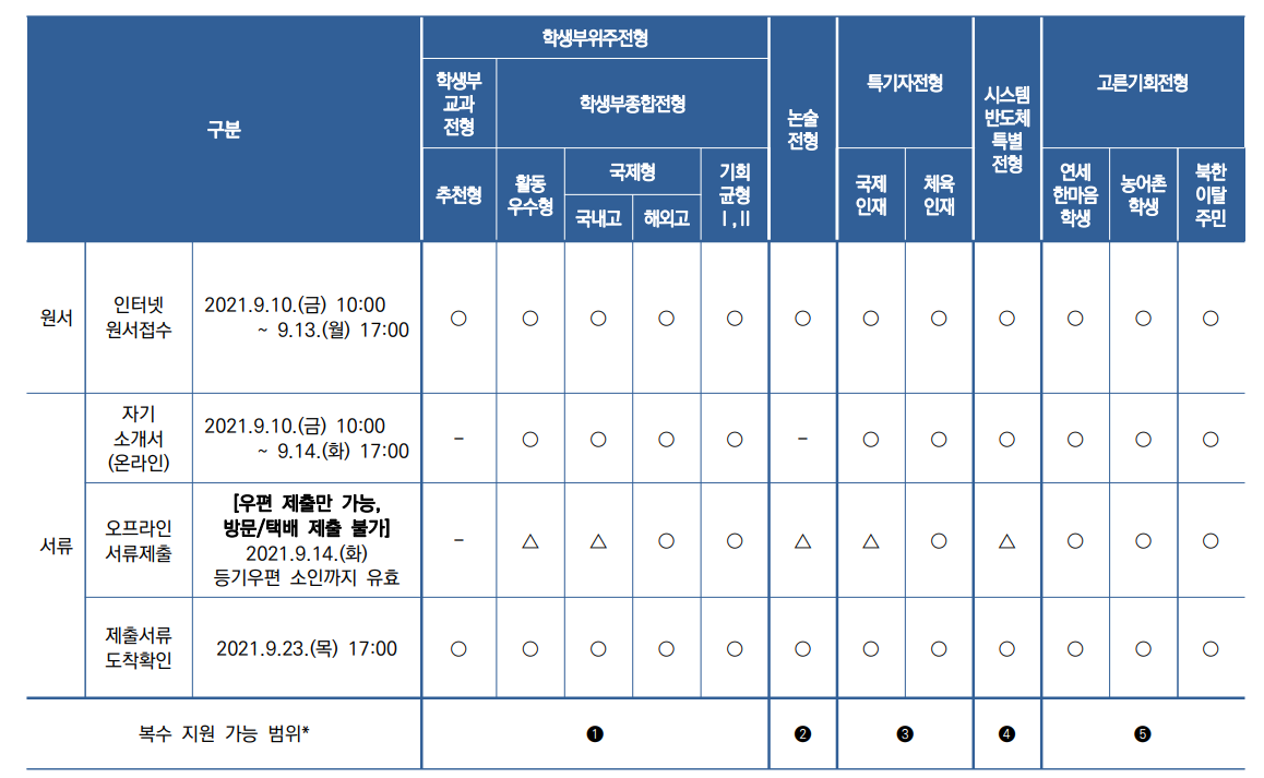 연세대학교 수시전형에서 가장 큰 변화는 학생부종합 면접전형이 학생부교과 추천형으로 변경된 것일 것입니다. 인원은 그대로 523명입니다. 학생부 종합전형 활동우수형 540명, 국제형 273명, 기회균형1 80명, 기회균형II 30명 등 1,446명이 학생부 위주 선발인원입니다. 논술전형은 346명, 특기자 전형은 162명입니다. 원서접수 일정은 9월 10일부터 9월 13일까지입니다.