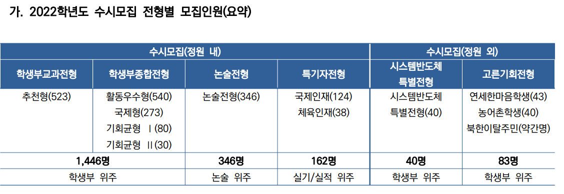 가장 상위권 대학으로 소위 SKY라인으로 부르고 있는 서울대, 연세대, 고려대는 수시 모집 비중이 상당히 높았던 편으로 속했는데 2022년부터는 정시 모집이 40%로 확대되면서 과거와 같이 학생부 종합 전형을 통한 수시입학의 문은 좁아졌다고 볼 수 있습니다. 서연고 3개 대학의 2022학년도 주요 수시모집 전형 내용과 2021학년도 수시등급대는 어느 정도였는지 알아보겠습니다.