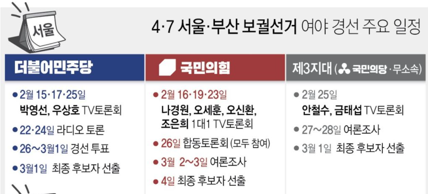 후보 선출과 단일화 등의 일정을 거치면 3월 18일부터 19일까지는 후보자 등록 신청이 있게됩니다. 3월 25일부터는 공식 선거기간 일정이 시작됩니다. 3월 36일까지 선거인 명부 확정, 선거공보 제출 등의 일정이 진행됩니다. 4월 2~3일는 사전투표일, 4월 7일 보궐선거일로 이어집니다.