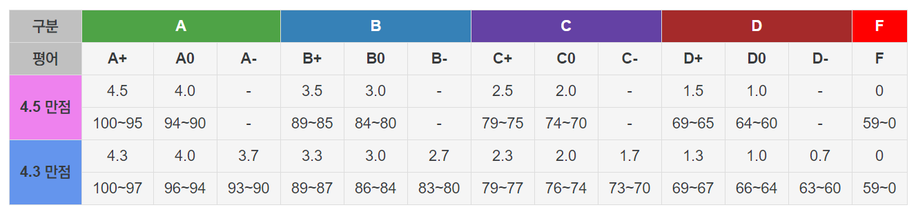 총 평점이 3.3~3.5점이면 B+이상으로 이 정도는 되어야 취업 등에 유리하니 관리가 필요하겠습니다. 일반적으로 졸업 기준 평균 평점은 C0로 2.0이상은 되어야 졸업이 가능합니다.