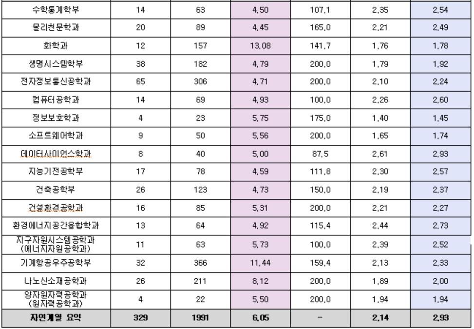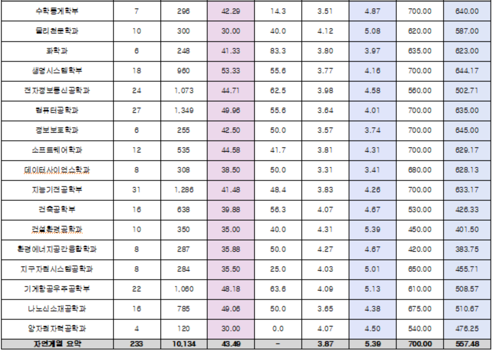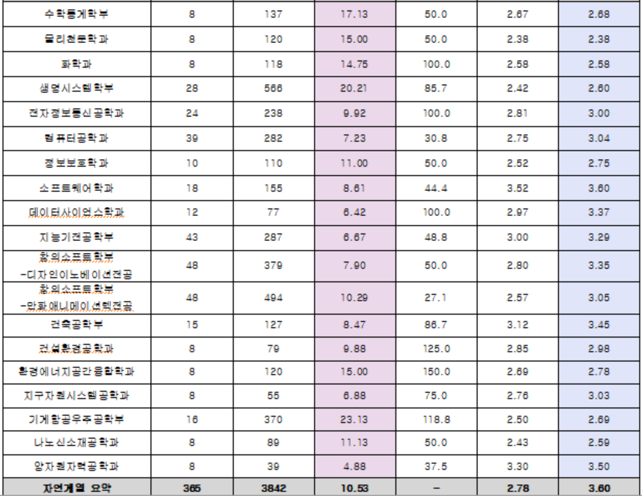 먼저 학생부 교과를 살펴 보면 인문계열 평균은 1.74등급, 80%컷등급은 2.35입니다. 등급 평균이 가장 높았던 학과는 행정학과로 1.40이었으며 2.33등급의 국어국문학과가 가장 낮았습니다. 자연계 평균은 2.14등급이이며 80%컷은 2.93입니다. 자연계에서는 화학과가 1.76으로 가장 높은 평균이며 환경에너지공간융합학과가 2.44로 가장 낮은 평균 등급입니다. 인문계 입결이 1등급 후반대로 높은 편입니다.