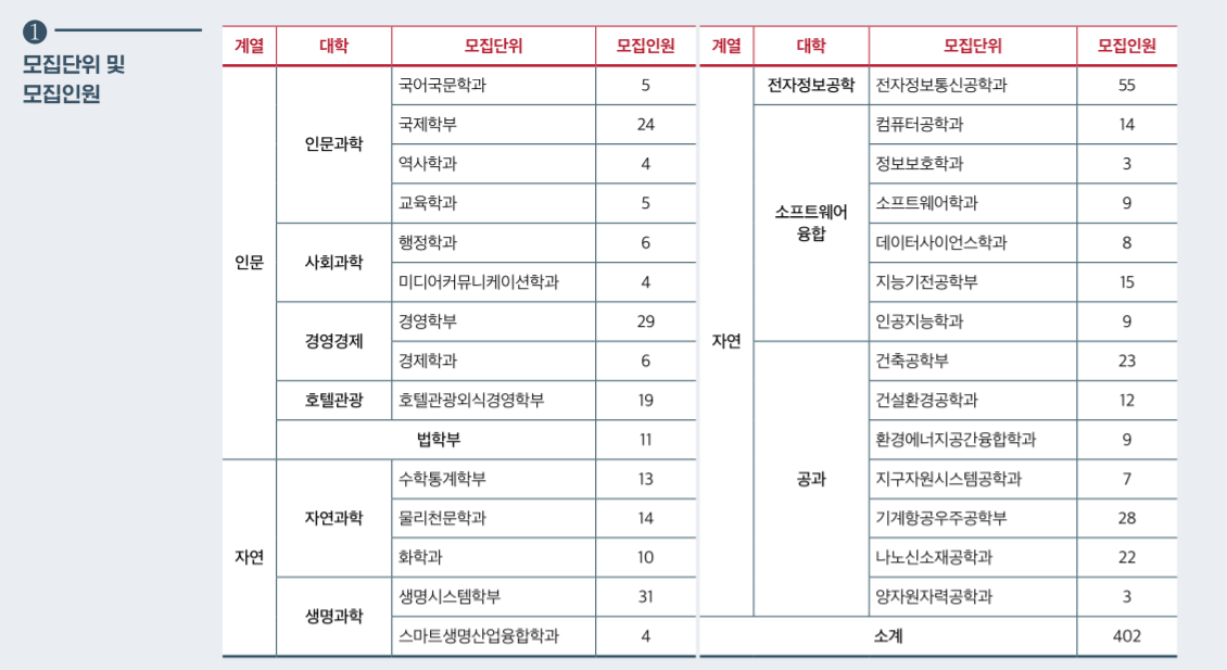 학생부교과 전형 중 학생부 우수자 전형은 교과 성적 100%를 반영합니다. 수능최저학력기준, 면접은 적용, 실시하지 않습니다. 교과 성적은 인문계는 국어, 영어, 수학, 사회, 과학이며 자연계는 사회과목을 제외한 나머지 4개 과목을 반영합니다. 모집인원은 402명입니다. 학년별 반영 비율은 별도로 명시되어 있지 않으므로 전학년 성적이 우수한 수험생이 유리합니다.