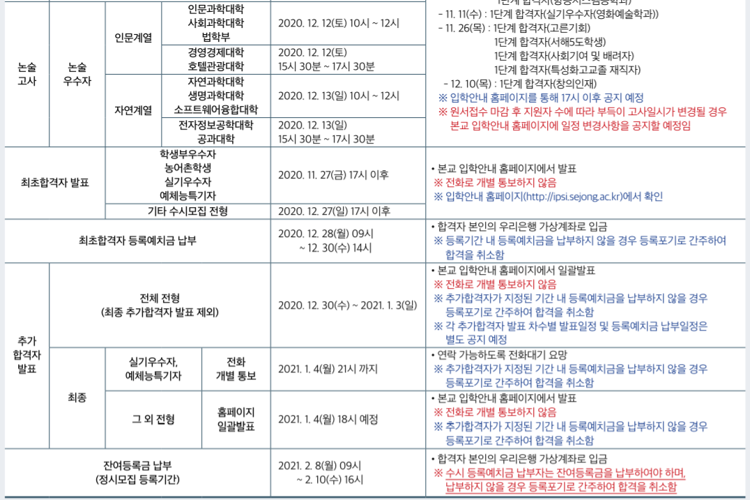 세종대 수시모집 원서접수기간은 9월 25일부터 28일까지입니다. 학생부우수자전형, 실기자 전형 합격자 발표는 11월 27일이며 대부분의 수시모집합격자 발표는 12월 27일입니다.