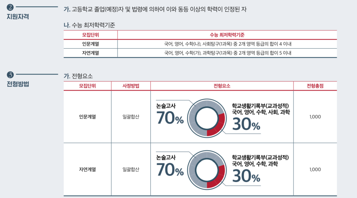 논술우수자전형은 353명을 선발합니다. 논술고사 70%, 학생부 교과 30%를 반영하며 수능최저학력기준이 있습니다. 인문계는 국어, 영어, 수학나형, 사회 과목 중 2개영역 합 4이상, 자연계는 국어, 영어, 수학가형, 과학 과목 중 2개영역 합 5이상입니다. 인문계는 통합교과형, 자연계는 수리논술형으로 출제됩니다. 난이도는 아주 어려운 편은 아니며 대학에서 진행하는 모의논술고사가 도움이 될 것입니다.