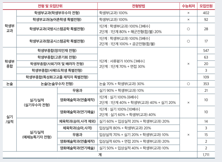 학생부종합 주요 전형인 창의인재전형은 547명을 선발합니다. 전형 방법은 학생부, 자기소개서 100%로 1단계 3배수 선발, 2단계 1단계 성적 70%, 면접 30%입니다. 수능 최저 학력 기준은 적용하지 않습니다.
