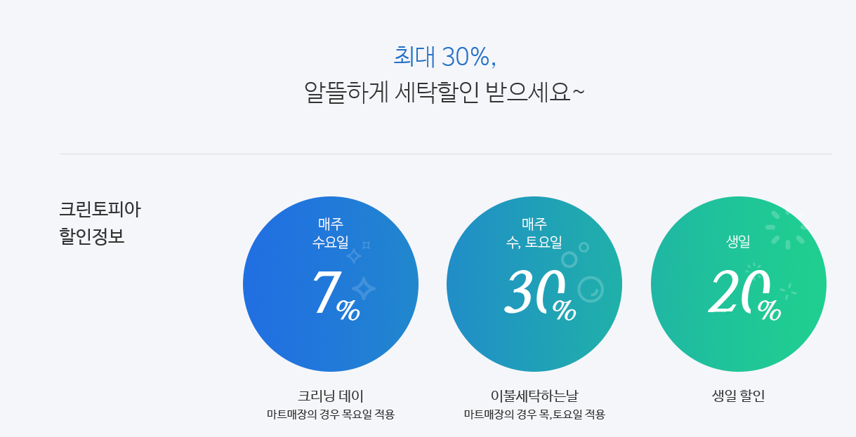 크린토피아에서 제공되는 서비스는 기본적인 세탁 외에 수선도 가능하며 이에 대한 가격도 홈페이지를 통하여 확인할 수 있습니다. 할인 정보도 확인 할 수 있으니 해당이 되는 지도 체크해 봐야겠습니다. 이불 등 침구류의 경우는 매주 수요일과 토요일 30% 할인을 적용 받을 수 있습니다. 생일의 경우는 20%를 할인 받을 수 있으니 생일에는 세탁을 맡기는 것이 괜찮을 것 같습니다.